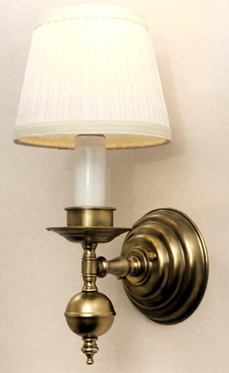 Antique brass Colonial single arm wall sconce. Great in pairs beside a master bed or bathroom vanity mirror, beside decorative picture frames, powder room or wherever that 'tailored' look is required. Choose your metal, back plate, lower finial and white, egg shell or black shade. It's your design... it's YOUR home!