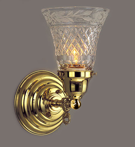 Here is a diamond cut glass shade dressing this lovely Colonial two light wall lamp. Custom width is fine. Perfect in pairs. See the next light for the single light version MODEL NS179.