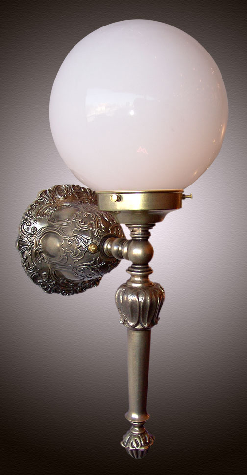 AWARD WINNING! Our original CLC 'Globe Torch' light fixture was used in a movie. A classy piece for  it's refined design and historic accuracy, it features a very ornate Victorian back plate and the stem is one solid piece of cast brass. Imagine these on a dark marble wall, spiraling up a curved wide staircase in a Southern mansion. Now imagine it in YOUR home! Finished in Antique Brass with a clean White Opal glass globe. It's even more beautiful when it's turned on!